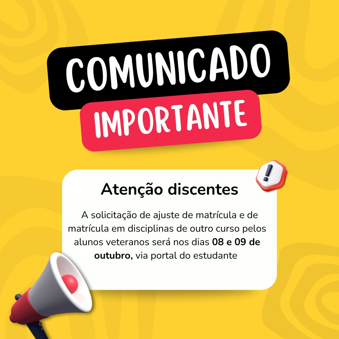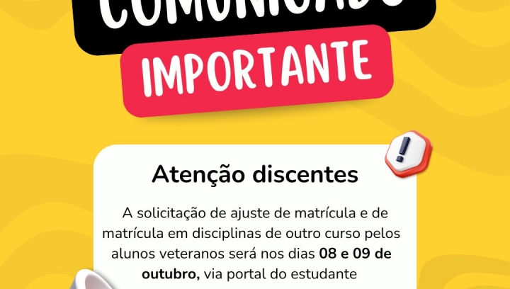 A solicitação de matrícula pelos alunos veteranos deverá ser realizada via portal do estudante, nos dias 02 e 03 de outubro.
